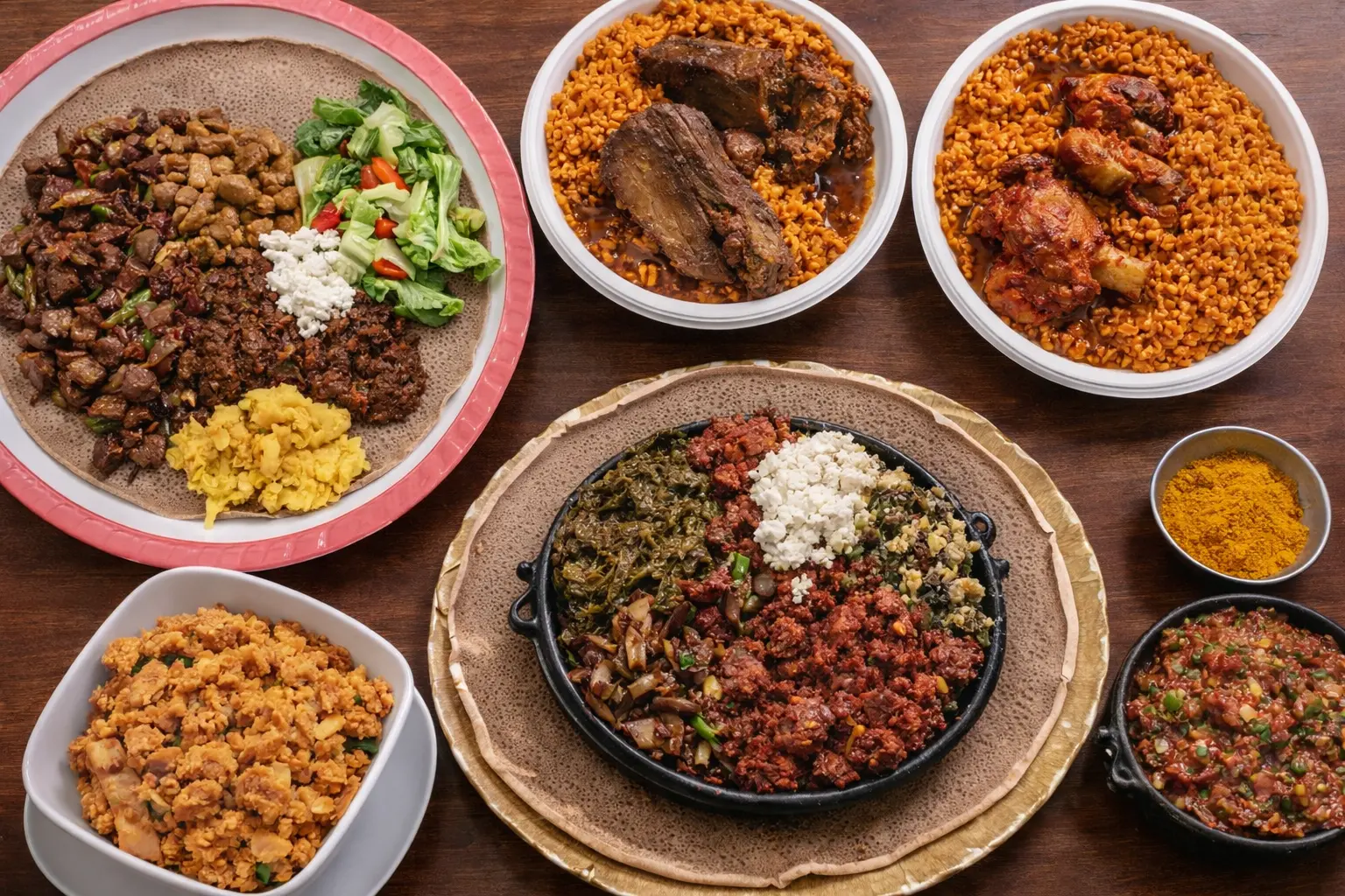 Traditional Ethiopian Cuisine with Injera, Doro Wot, Tibs & Veggie Platters